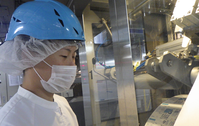 私は、主に学校給食で提供されている200㎖のブリックパックの製造ラインを担当しています。機械の操作を行うオペレーション業務や充填された製品・機械の点検、機械の清掃・メンテナンスなどを行っています。お客様に安心・安全な製品を提供できるように他の従業員と協力して、ひとつひとつの作業を確実に行っています。